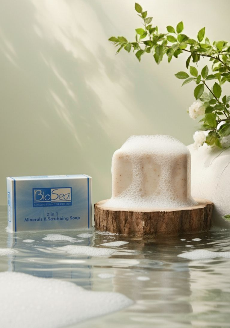 يجمع صابون Bio Sea 2-in-1 Mineral & Scrubbing بين معادن البحر الميت والحبوب المقشرة لإزالة السموم من المسام والتحكم في حب الشباب وتغذية البشرة، مما يوفر تجديدًا يشبه المنتجع الصحي متجذرًا في تقاليد العناية بالبشرة الطبيعية في الأردن.
