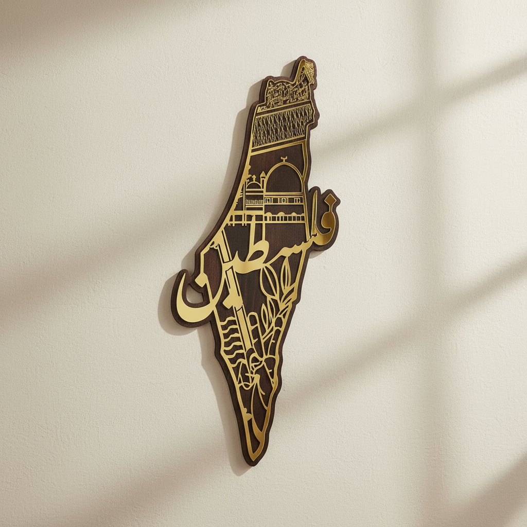 قطعة ديكورية جميلة مصنوعة من الخشب الهندسي عالي الجودة، تتميز بخريطة فلسطين باللون الأكريليك الذهبي اللامع والكلمة العربية "فلسطين" بخط أنيق .